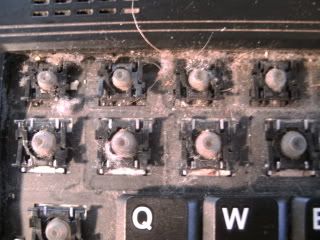 No wonder I had "sticky keys". And still do. *Sigh*. It was impossible to get it completely cleaned out, and when I tried to get the whole base out it sort of stuck in the middle and wouldn't budge, no matter how I tried to pull at it. I now have a slightly bent , non-working keyboard. I should learn to leave things alone.