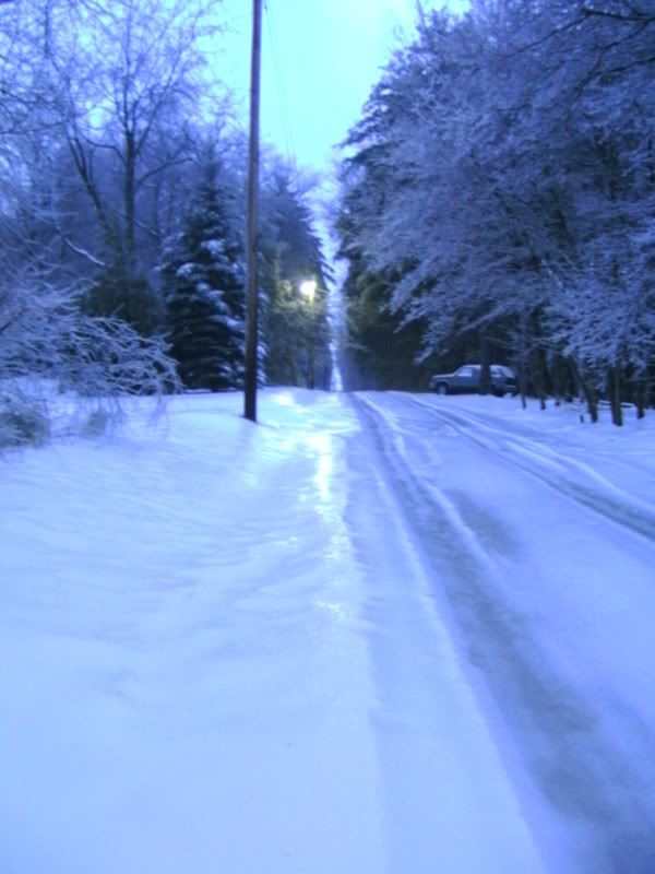 Walking up to the family trailer was an experience and a half! It was still pretty dark out, dawn only just making an appearance at 7 o'clock, and the lane was like a foreign landscape... thick, thick ice everywhere on the ground, laying on top of the previous snowfall ~ crunch, crunch all the way, breaking through the ice. (On my heels ~ I'm NOT going to fall over again!